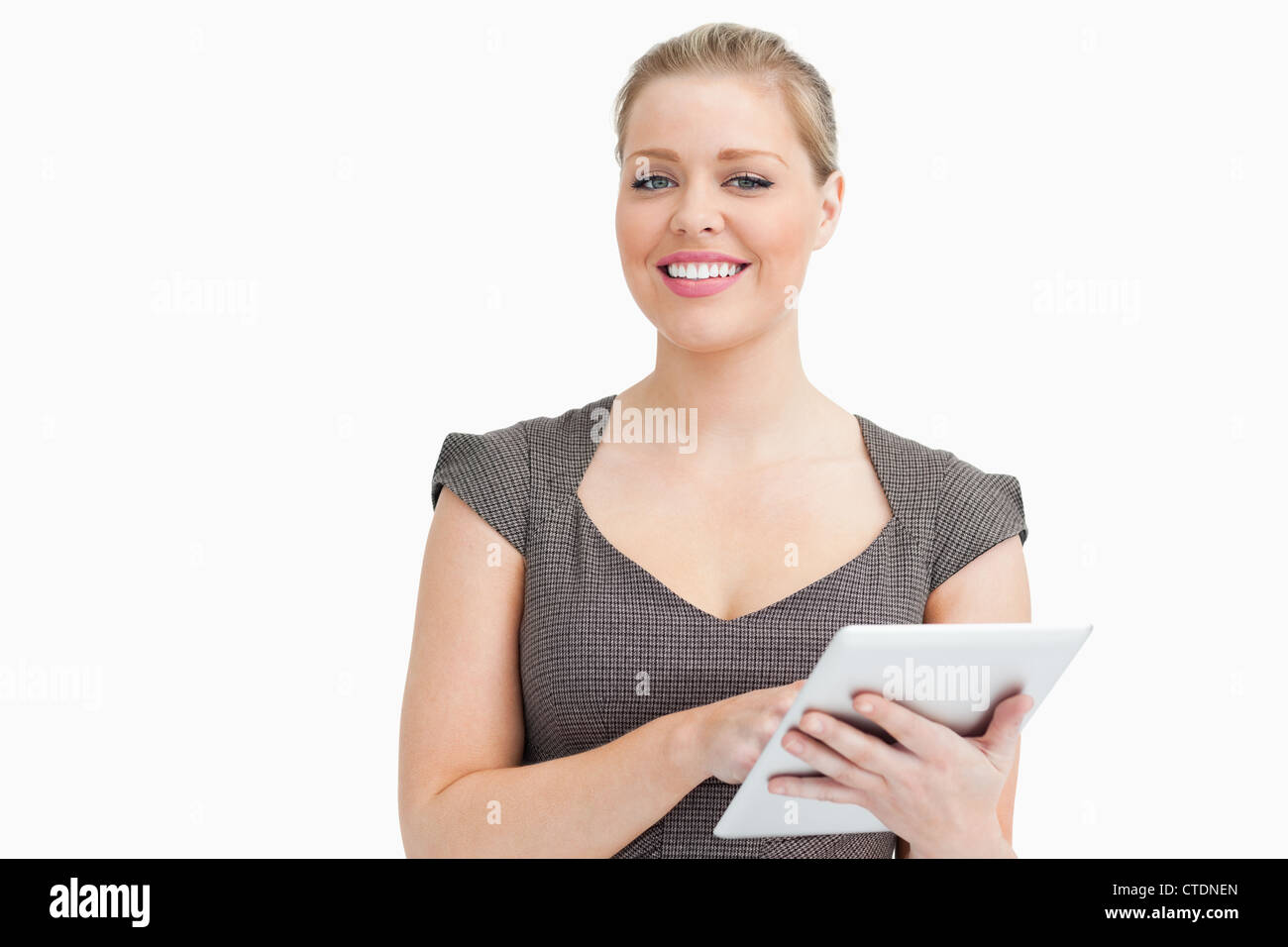 Woman smiling while using a tablet pc Stock Photo - Alamy
