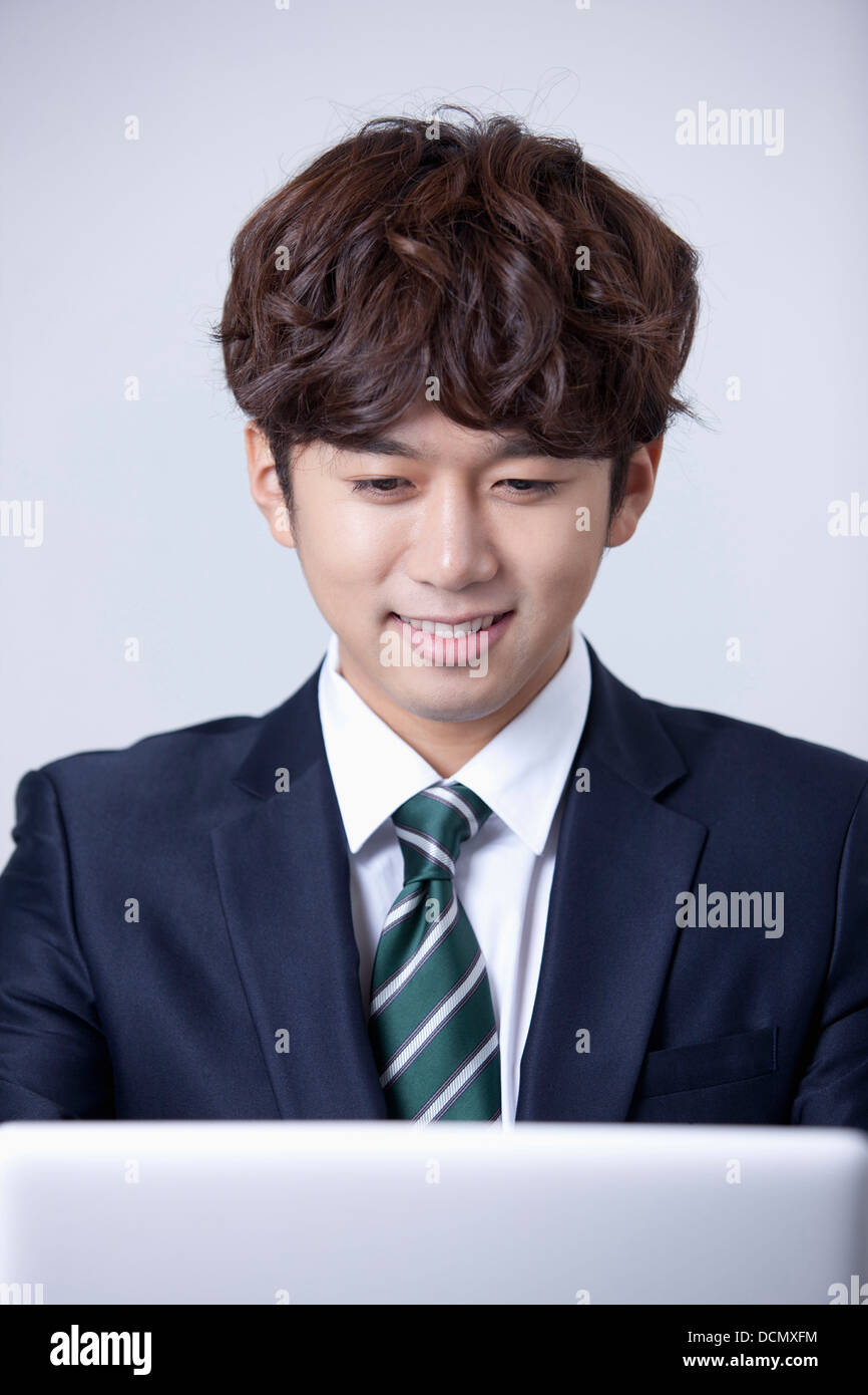a businessman smiling while using a laptop Stock Photo - Alamy