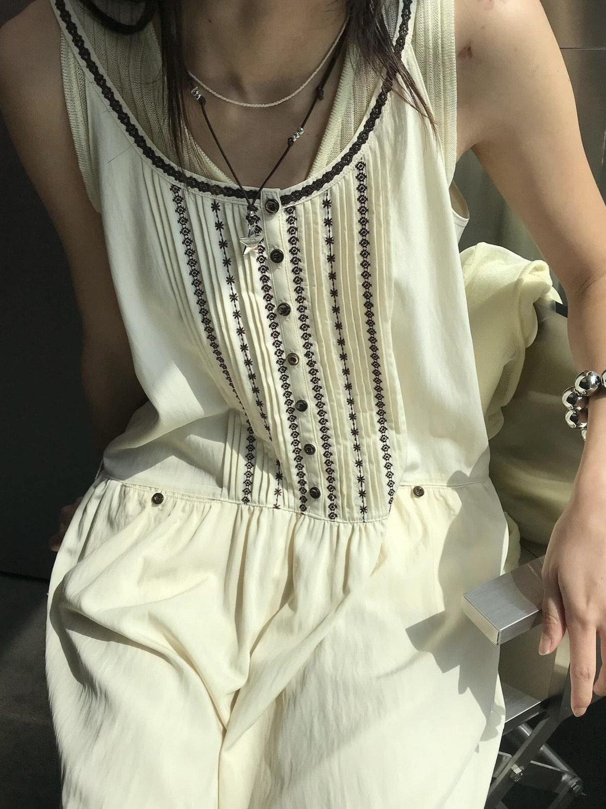 Smoid現 韓國設計文藝清新波西米亞刺繡寬鬆休閒壓褶吊帶洋裝女