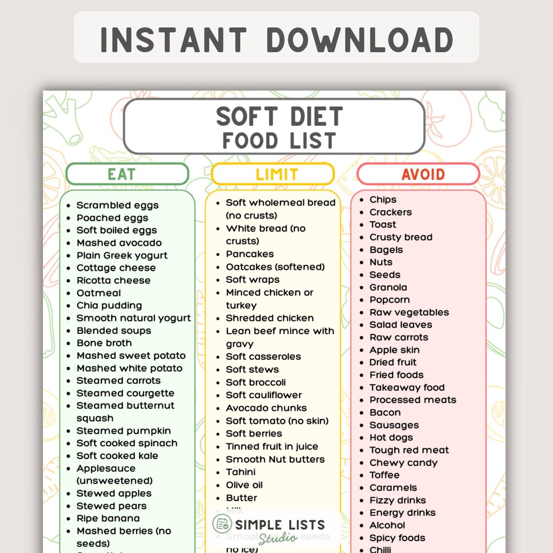 Soft Diet Food List Printable, Easy to Chew Foods Chart, Eat Limit ...