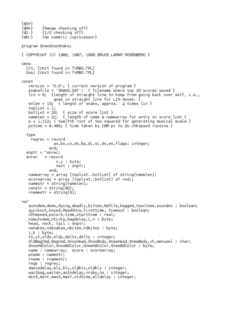 Snee Snoo Snake Game Turbo Pascal Code | PDF | Computing | Computer ...