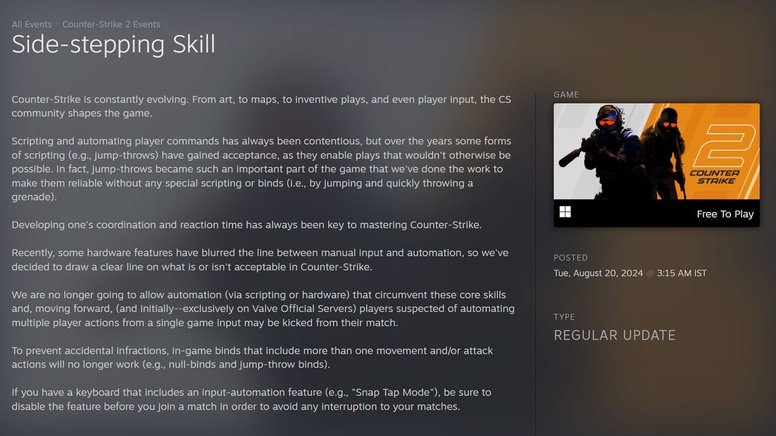 Valve Removes the Use of Snap Tap-Like Features From CS2