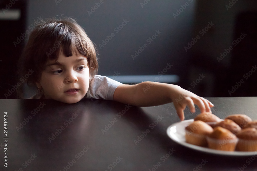 Cunning cute little girl stealing delicious muffin on table, hungry ...
