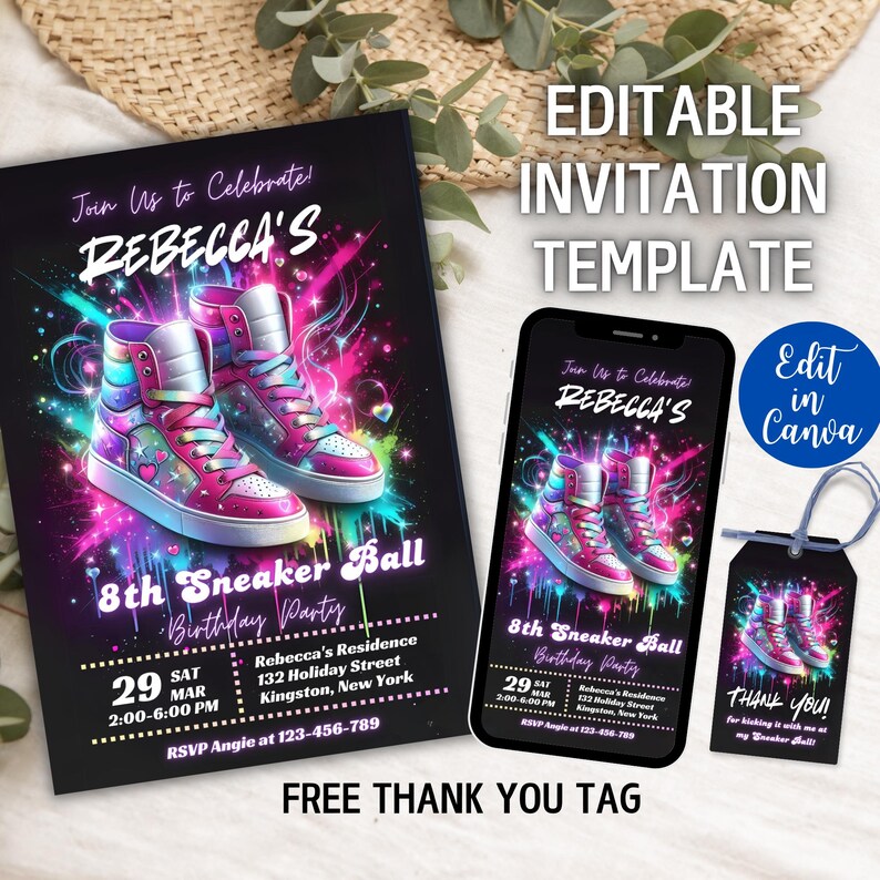 Editable Sneaker Ball Invitation, Neon Sneaker Birtday Invite, Sneaker ...
