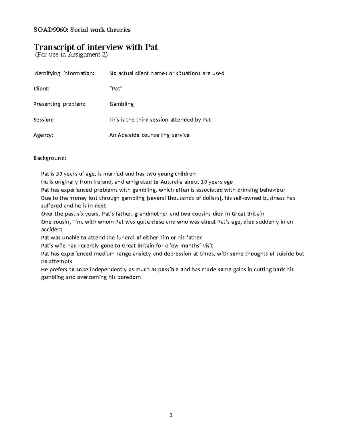 SOAD9060: Social Work Theories - Interview Transcript with Pat for ...