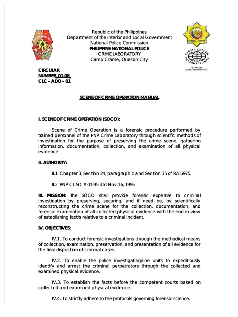SOCO Operations Manual Overview | PDF | Crime Scene | Forensic Science