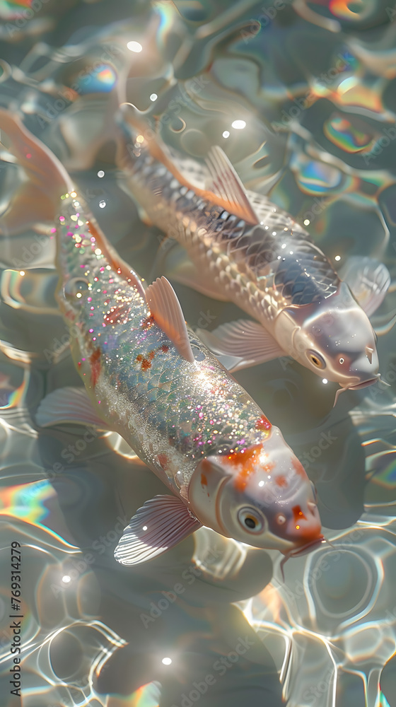 A pair of rayfinned fish gracefully swim in the fluid environment of ...