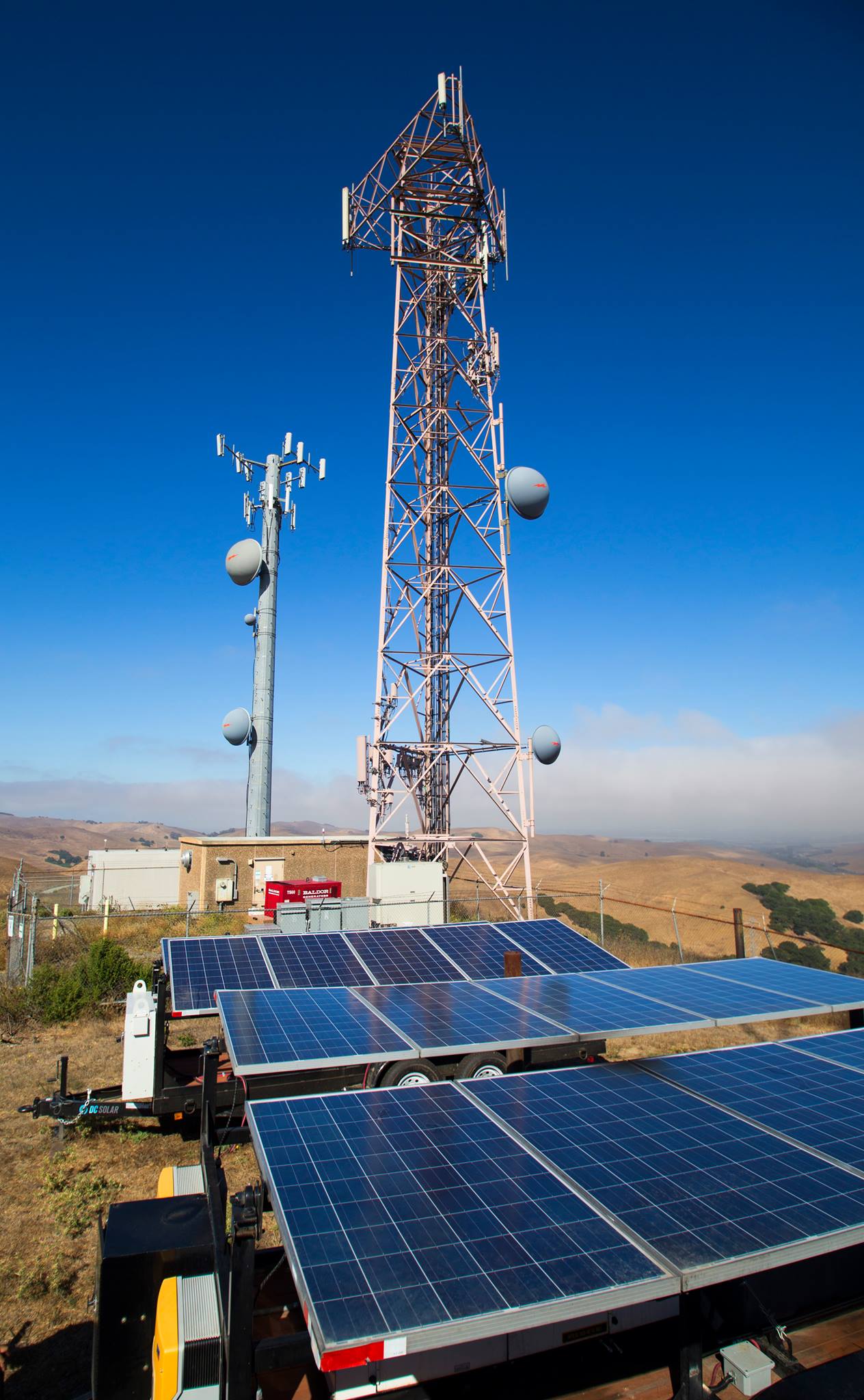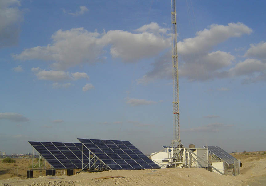 Microwave telecommunications relay tower powered by an array of ...