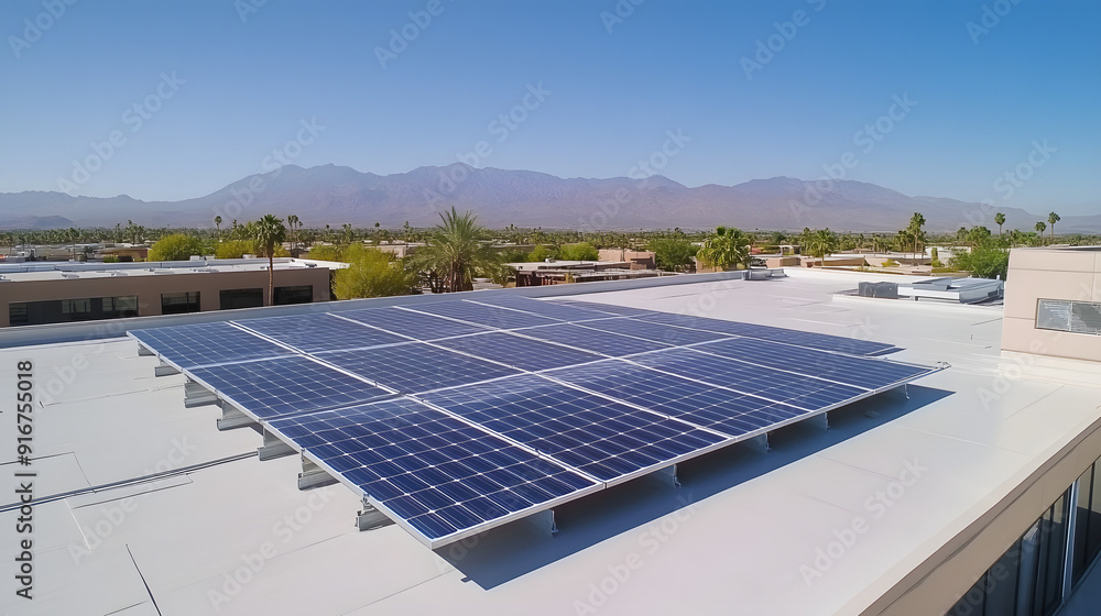 solar power panels installation on the roof of a high-rise building, 3D ...