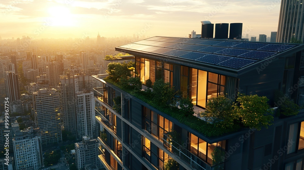 Solar Panels on a High-Rise Rooftop at Sunset Capturing Golden Light ...