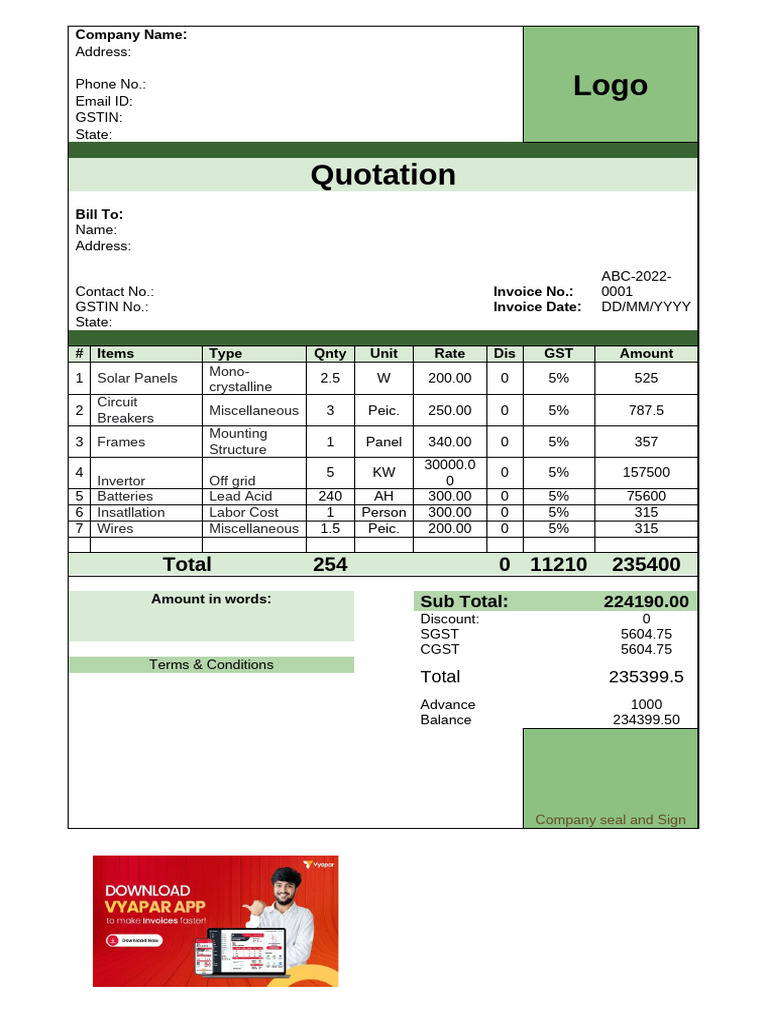 Solar Panel Quotation and Invoice Template | PDF | Finance & Money ...
