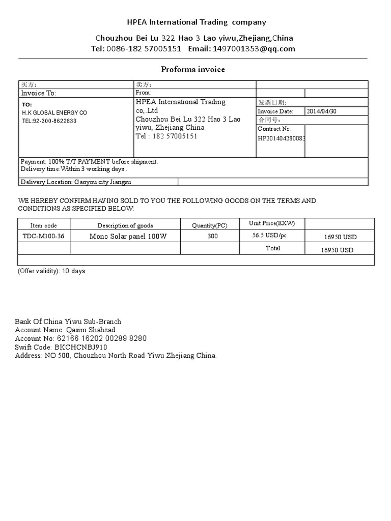 Ensun Energy Proforma Invoice for Solar Mounting Structure Materials ...