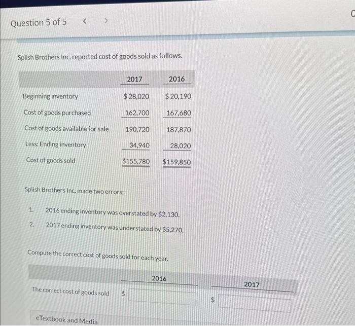 Solved Splish Brothers Inc, reported cost of goods sold as | Chegg.com