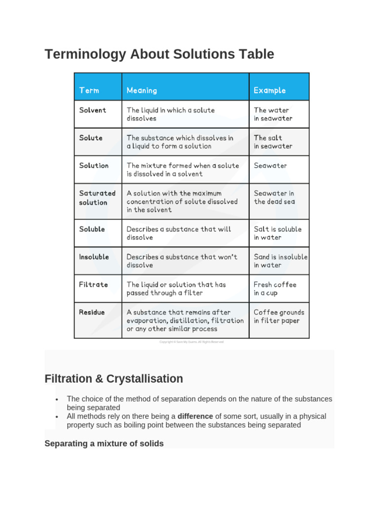 Terminology About Solutions Table | PDF | Distillation | Filtration
