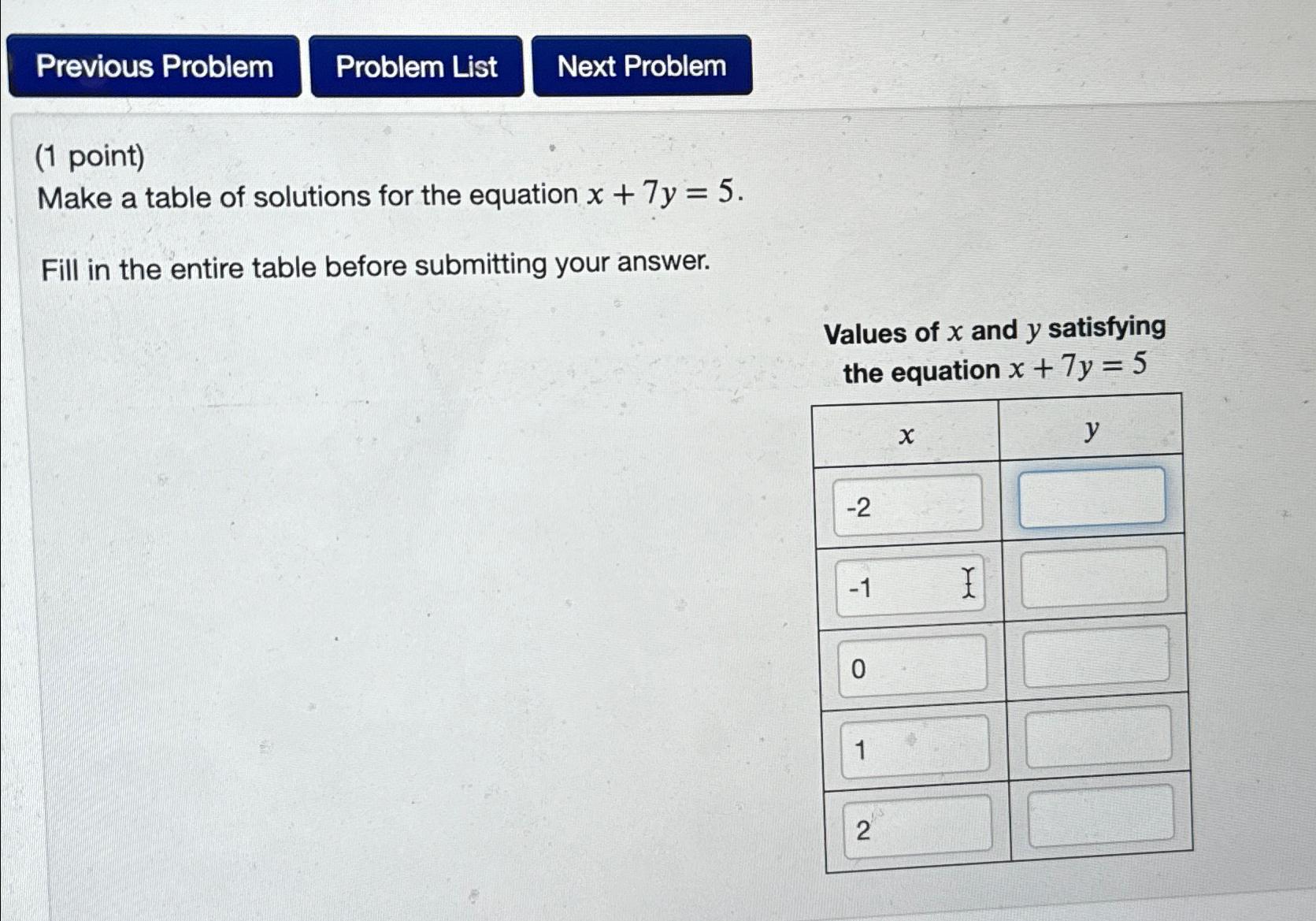 Solved (1 point)Make a table of solutions for the equation | Chegg.com