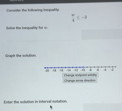 Solved: Consider the following inequality. w/4 ≤ -3 Solve the ...
