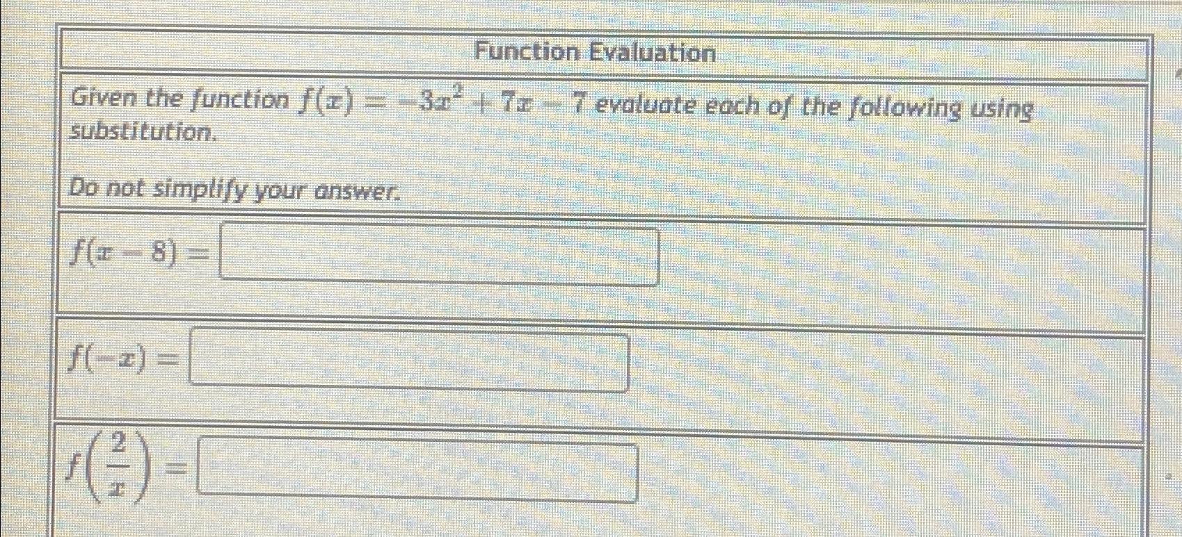 Solved Function EvaluationGiven the function f(x)=-3x2+7x-7 | Chegg.com