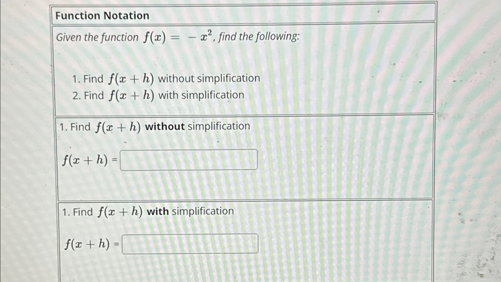 Solved Function NotationGiven the function f(x)=-x2, find | Chegg.com