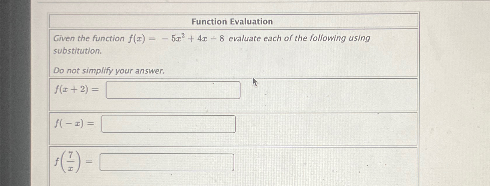 Solved Function EvaluationGiven the function f(x)=-5x2+4x-8 | Chegg.com