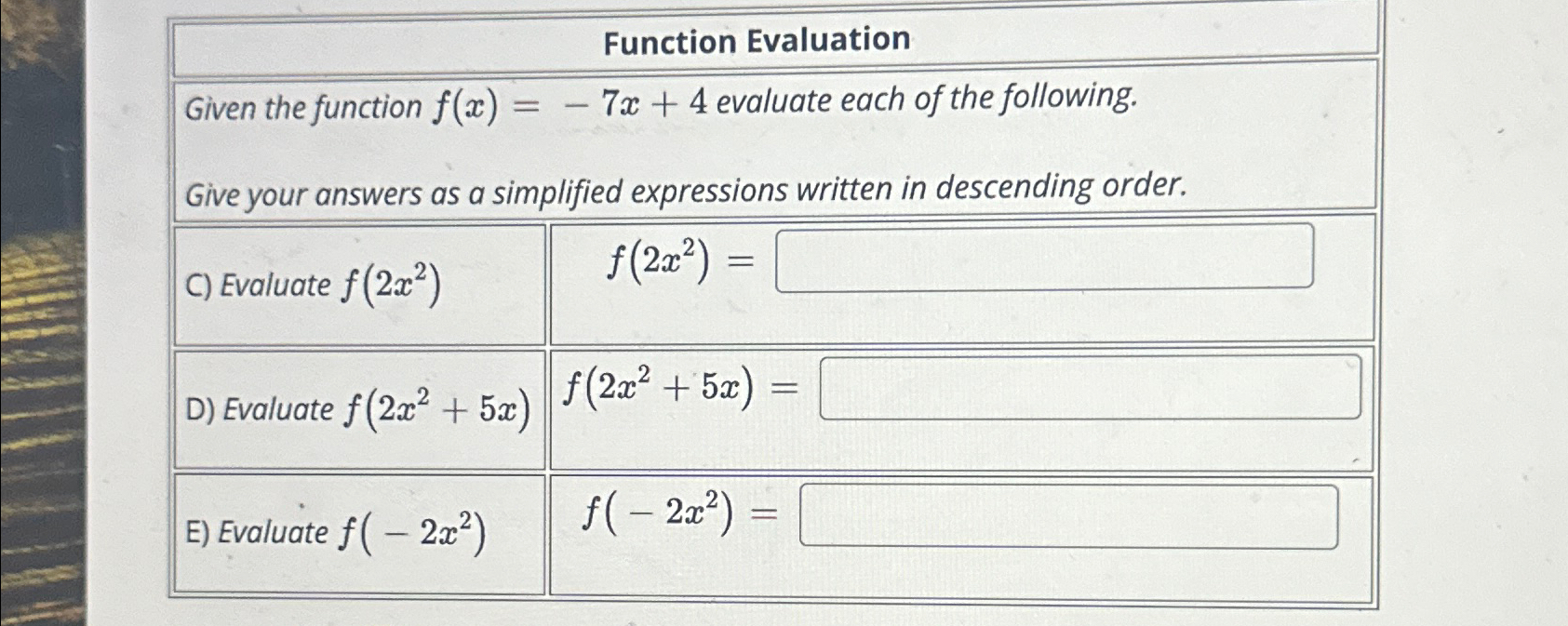 Solved Function EvaluationGiven the function f(x)=-7x+4 | Chegg.com