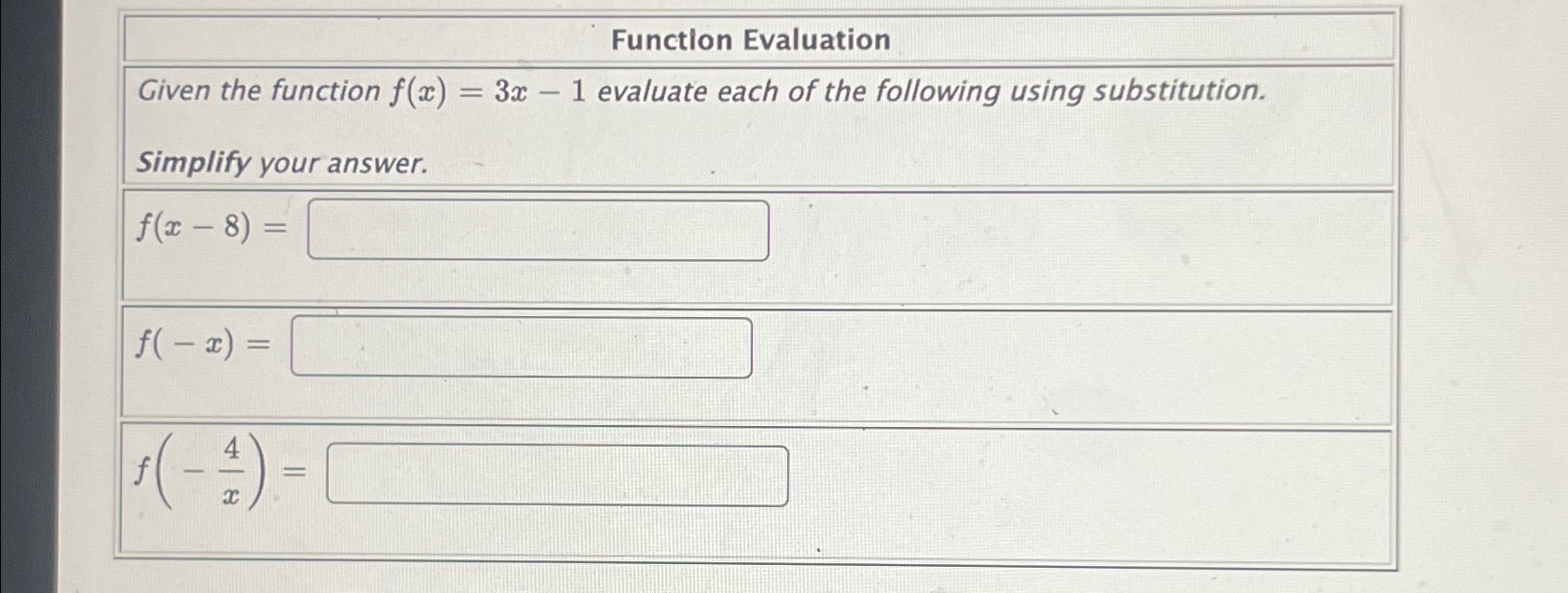 Solved Function EvaluationGiven the function f(x)=3x-1 | Chegg.com