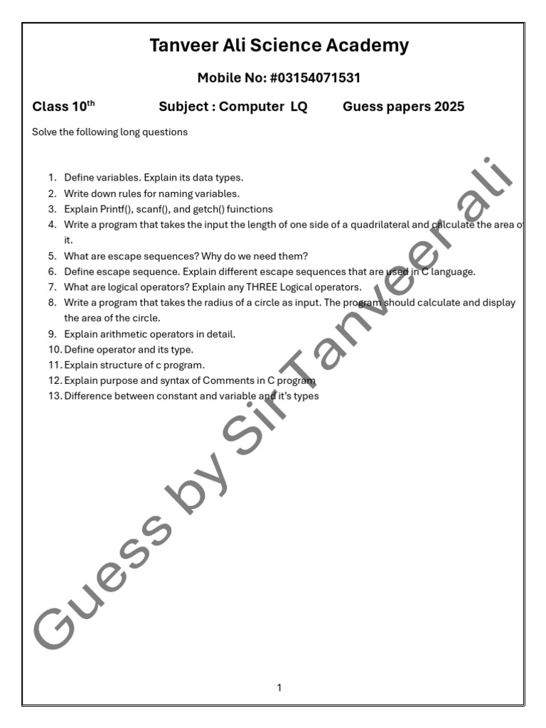 Class 10 Computer Science Guess Papers 2025 | PDF