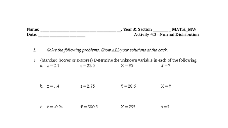 MATH_MW Activity 4.3: Solving Normal Distribution Problems - Studocu
