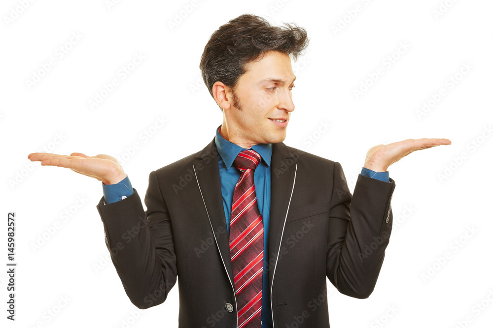 Geschäftsmann schaut beim Vergleich auf Hand Stock Photo | Adobe Stock