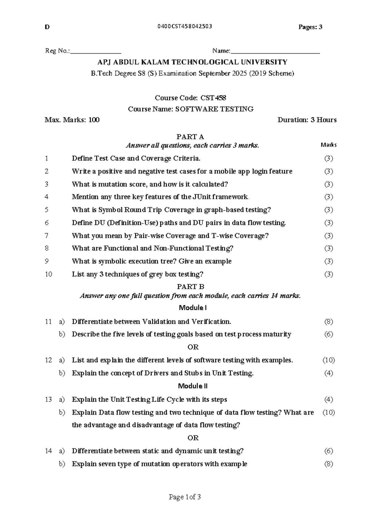 CST458 Software Testing Exam Qn Paper - Sept 2025 - Studocu