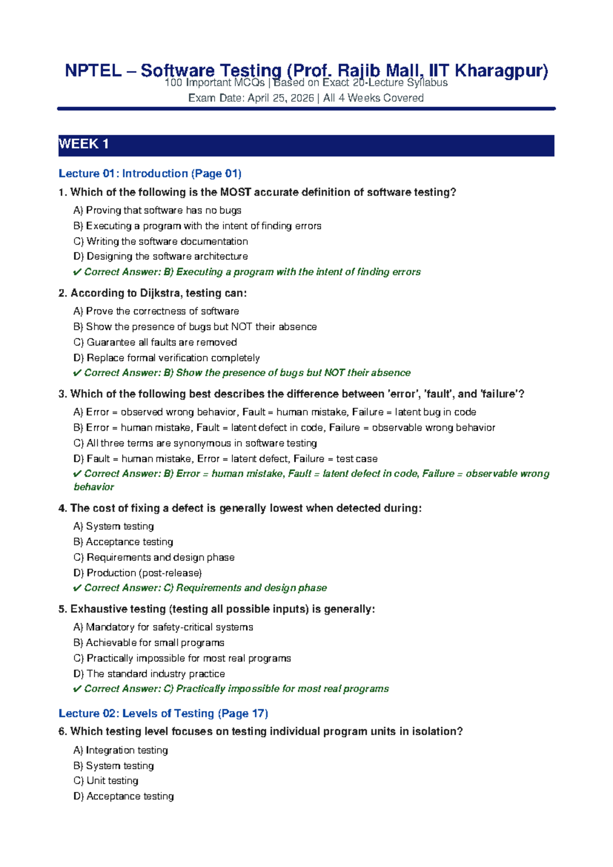 NPTEL Software Testing 100 MCQs for Final Exam Preparation - Studocu