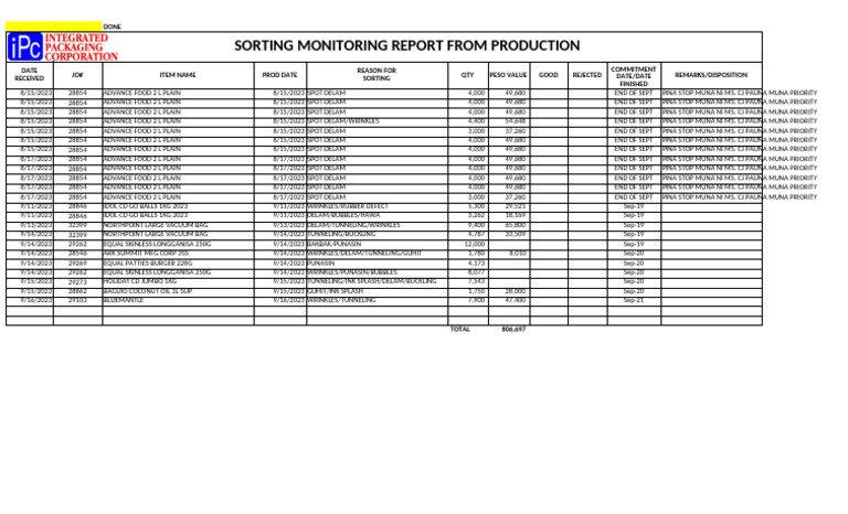 Sorting Monitoring Report From Production (Autorecovered) | PDF
