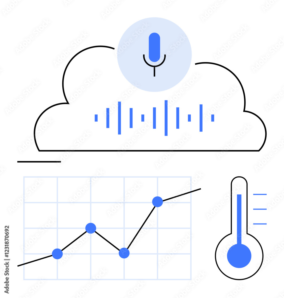 Voice recorder icon within a cloud, sound wave patterns, line graph ...