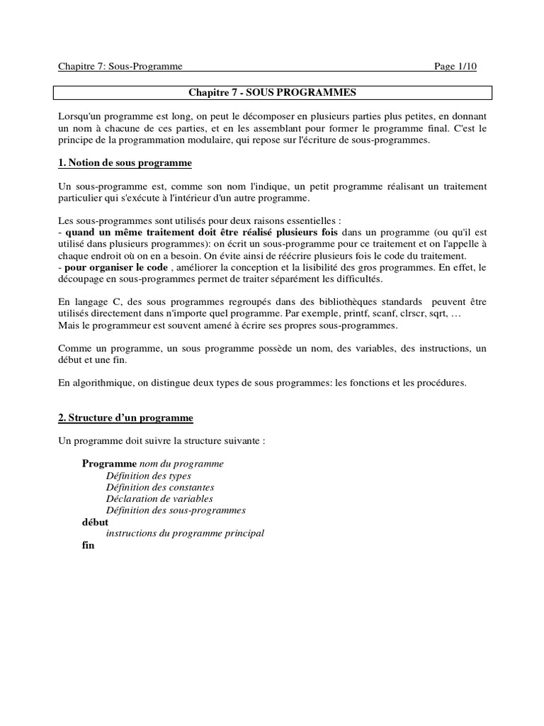 Chapitre 7 - Sous Programmes | PDF | Programme informatique | Programmation