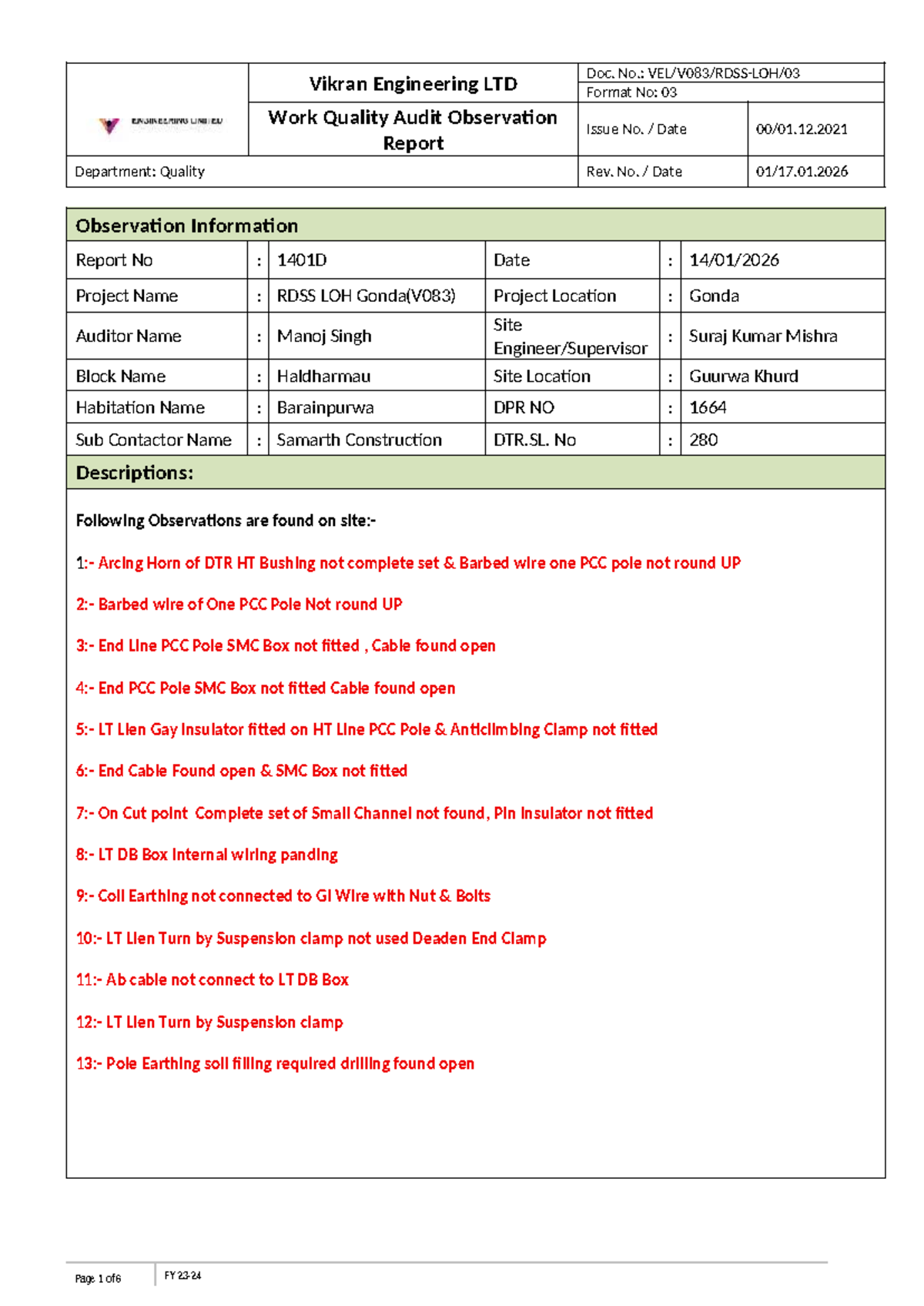 Vikran Engineering LTD Quality Audit Report for Project V083 Gonda ...
