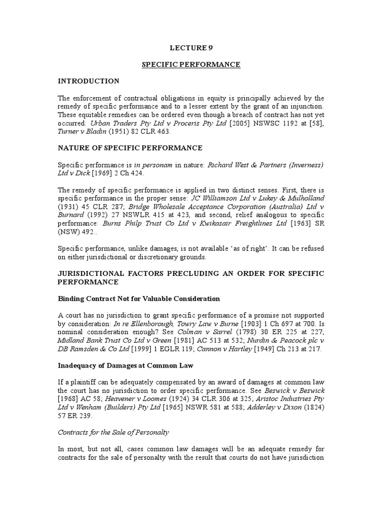 Topic 8 - Specific Performance: Legal Principles and Case Studies - Studocu