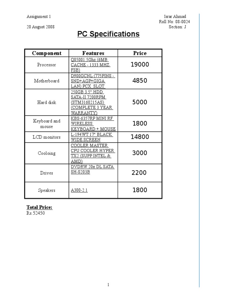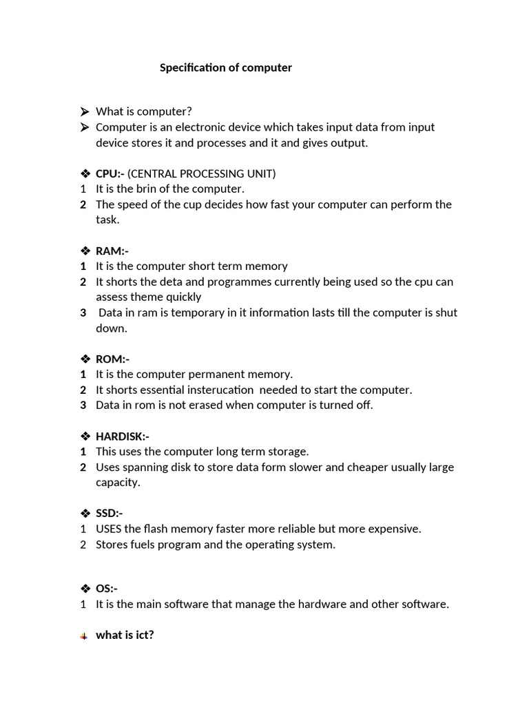 Computer Specification - Prepare Small Report On Major Specification of ...