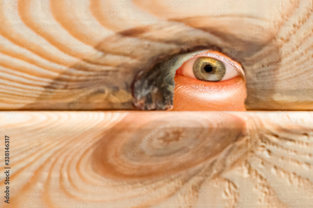 Closeup of a human eye peeking through blinds evoking curiosity ...