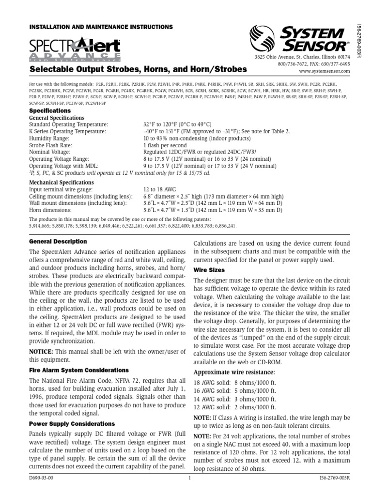 System Sensor SR SpectrAlert Wall-Mount Selectable Strobe 12/24V User ...