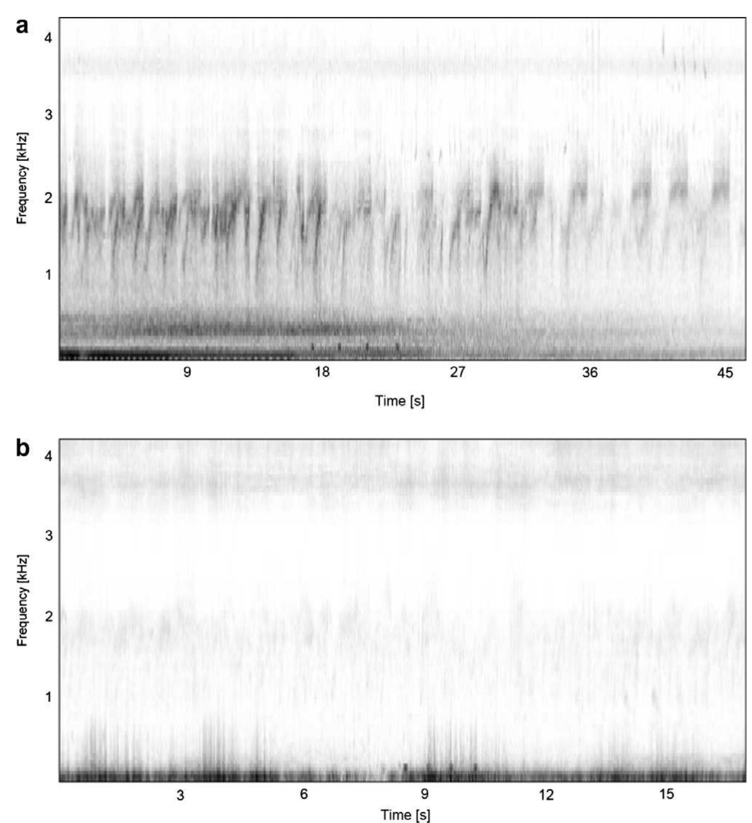 Spectrograms of noise (above) and a mating call of Hyla arborea from ...