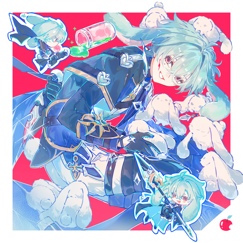 Safebooru - 1boy :d absurdres ahoge animal ears apple aqua hair arm ...