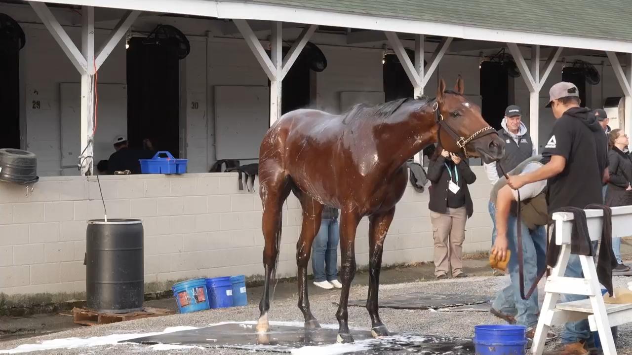 Kentucky Derby favorite Renegade gets a sponge bath after workout