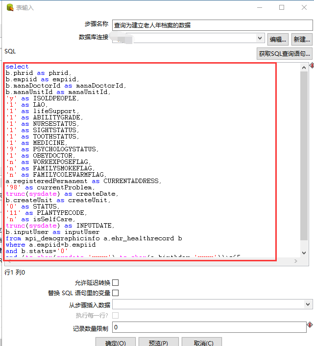Pentaho Spoon "Dynamic SQL row" step configure "Template SQL (to ...