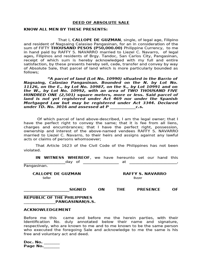Deed of Absolute Sale - Spouses Arturo Navarro | PDF | Real Property ...