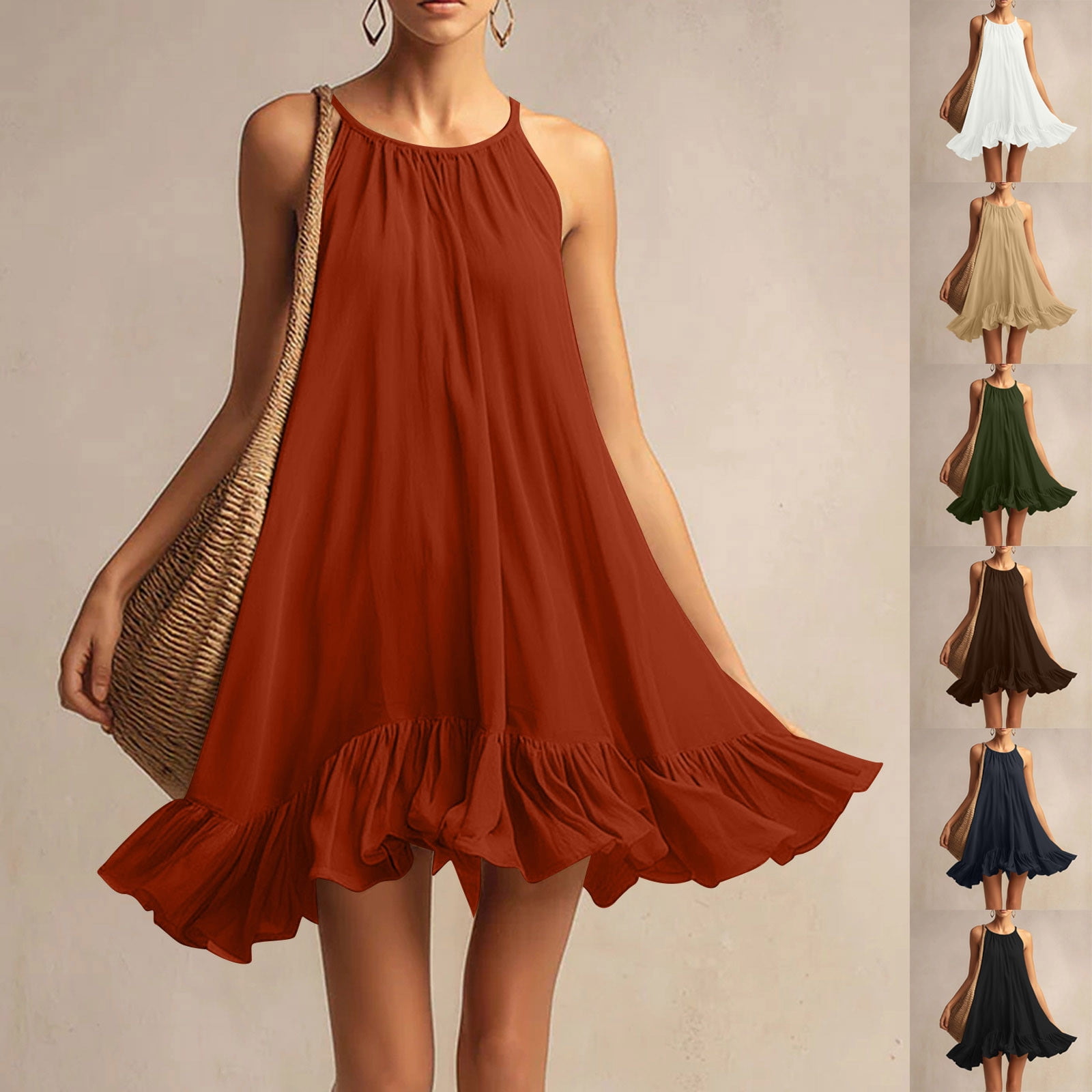 Ailaofu Women's Sleeveless Round Neck Tank Dress Solid Color Ruffled ...