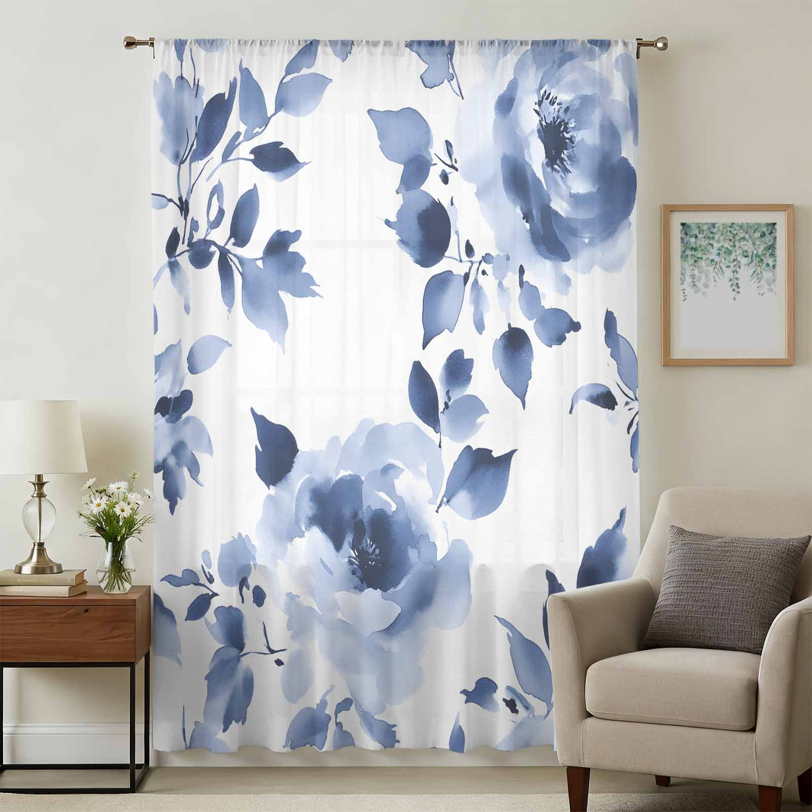 Blue Spring Floral Sheer Curtains 54 Inches Long, Summer Botanical ...