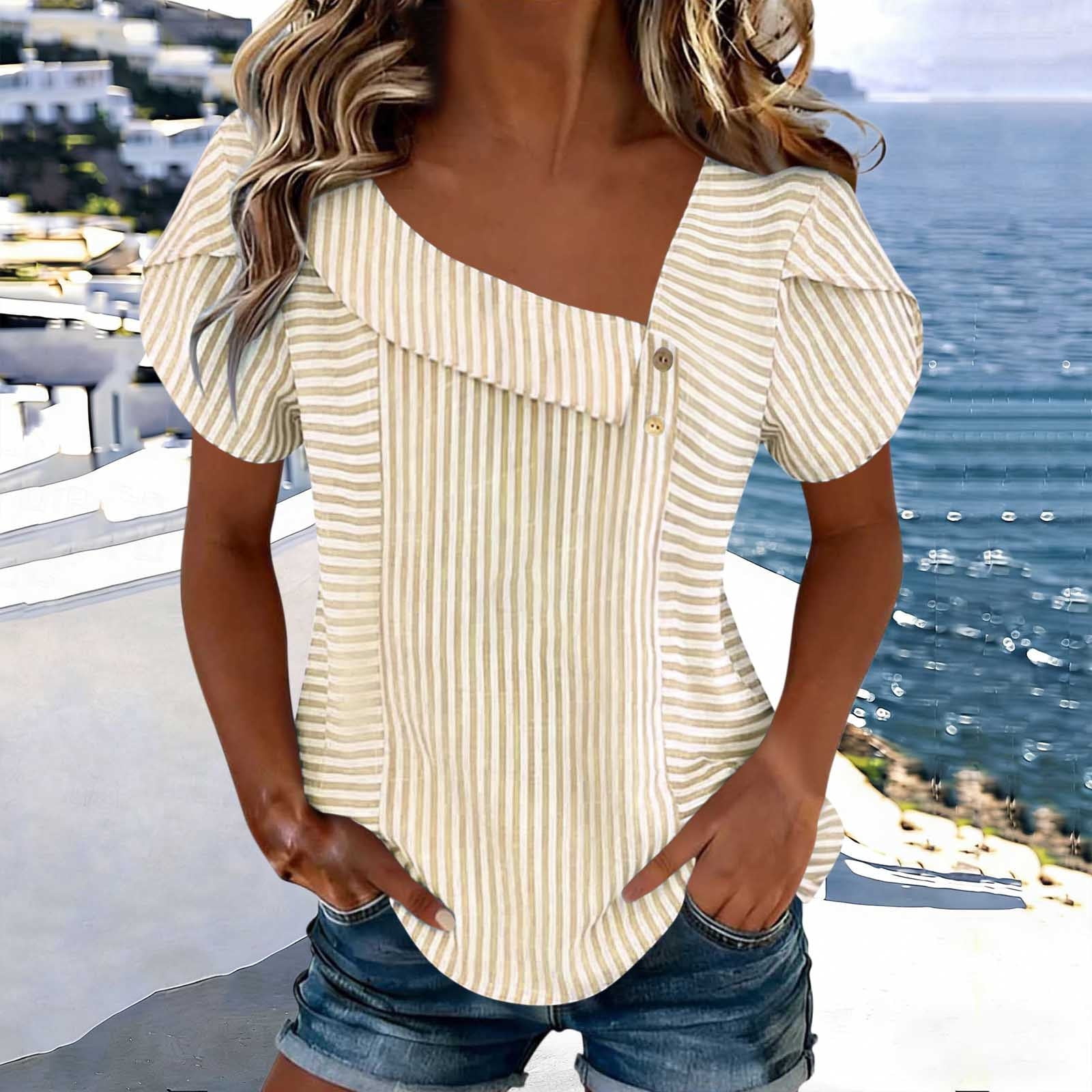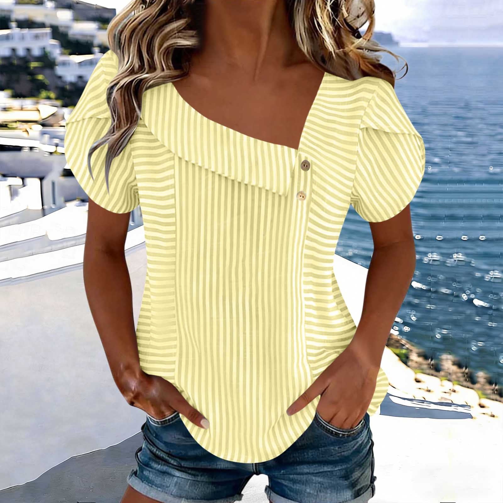 Craaazy Womens Short Sleeve Asymmetrical V-neck Turndown Collar Striped ...