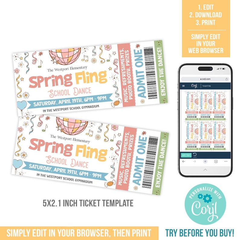 Editable Spring Fling Dance Tickets, School Spring Fling Ticket ...
