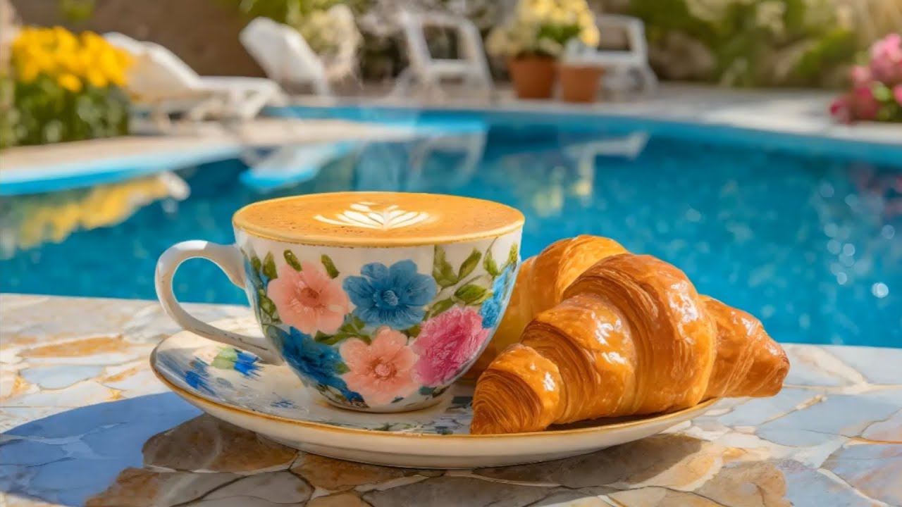 Peaceful Breakfast Scene With Coffee Croissant And Spring Blossoms ...