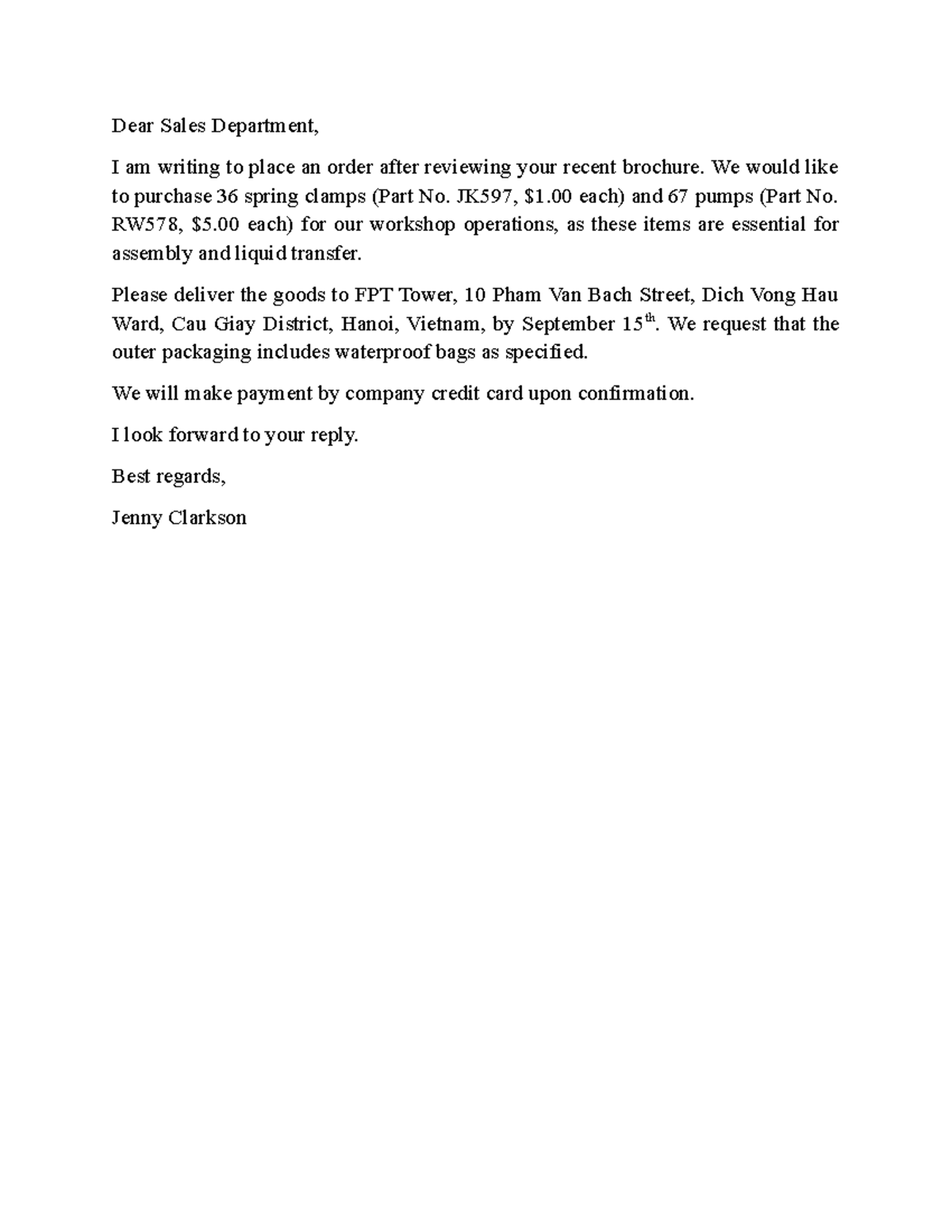 Order Request for Spring Clamps and Pumps - Writing Unit 4 - Studocu