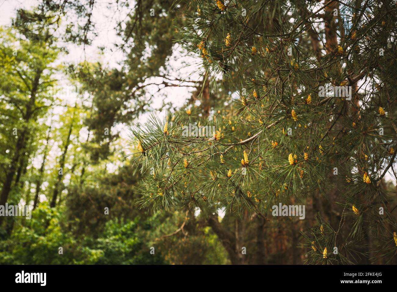 Fresh Small Spring Cones On Pine Tree In Forest Stock Photo - Alamy
